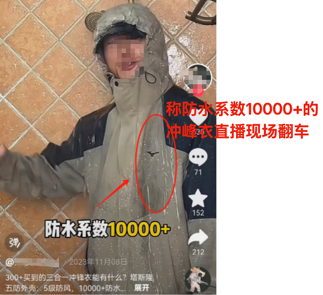 而这些”夹克”所号称的功能质量实在让人啼笑皆非,现场的实验已经出现渗水,主播仍屋持有效防水,实在让人无语。然而,市场监管对于这种打擦边球的劣币,却无力监管,只是让他们游走在法律边沿,令消费者蒙受损失。