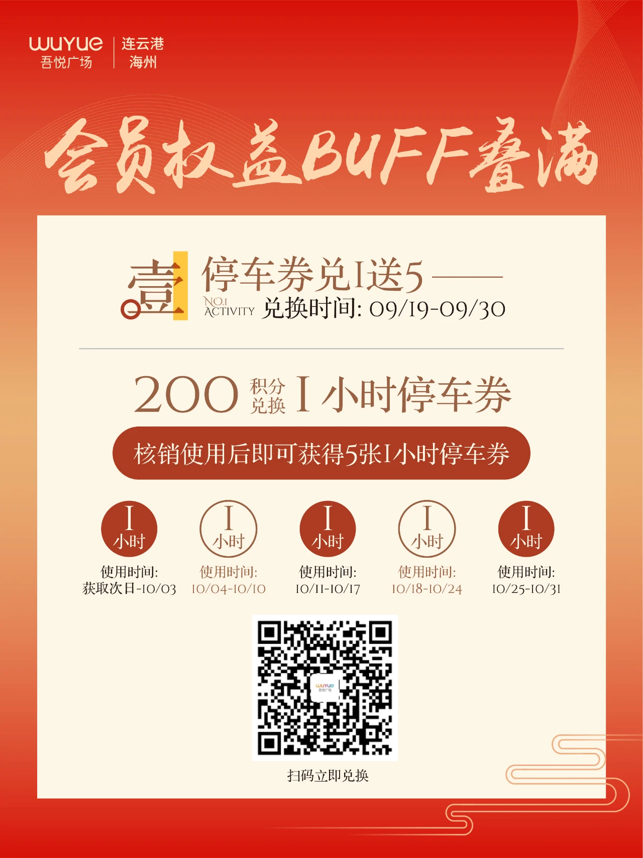 9月19日 - 30日,200积分兑1h停车券并核销,送5张1h券,停车超方便!