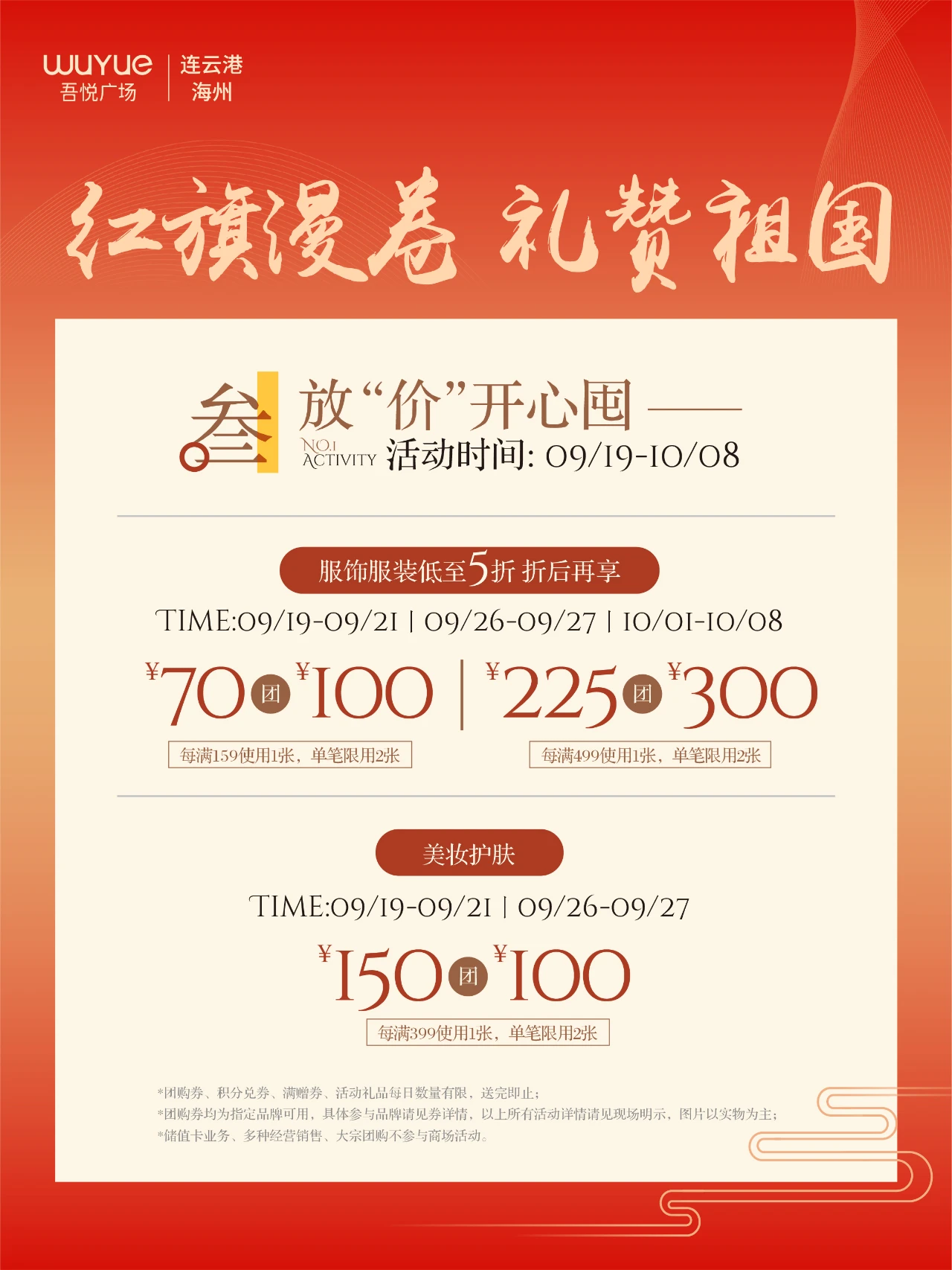 服饰服装低至5折:9月19 - 21日、9月26 - 27日、10月1 - 8日,服饰低至5折,折后70团100(满159用)、225团300(满499用),时尚单品轻松购!