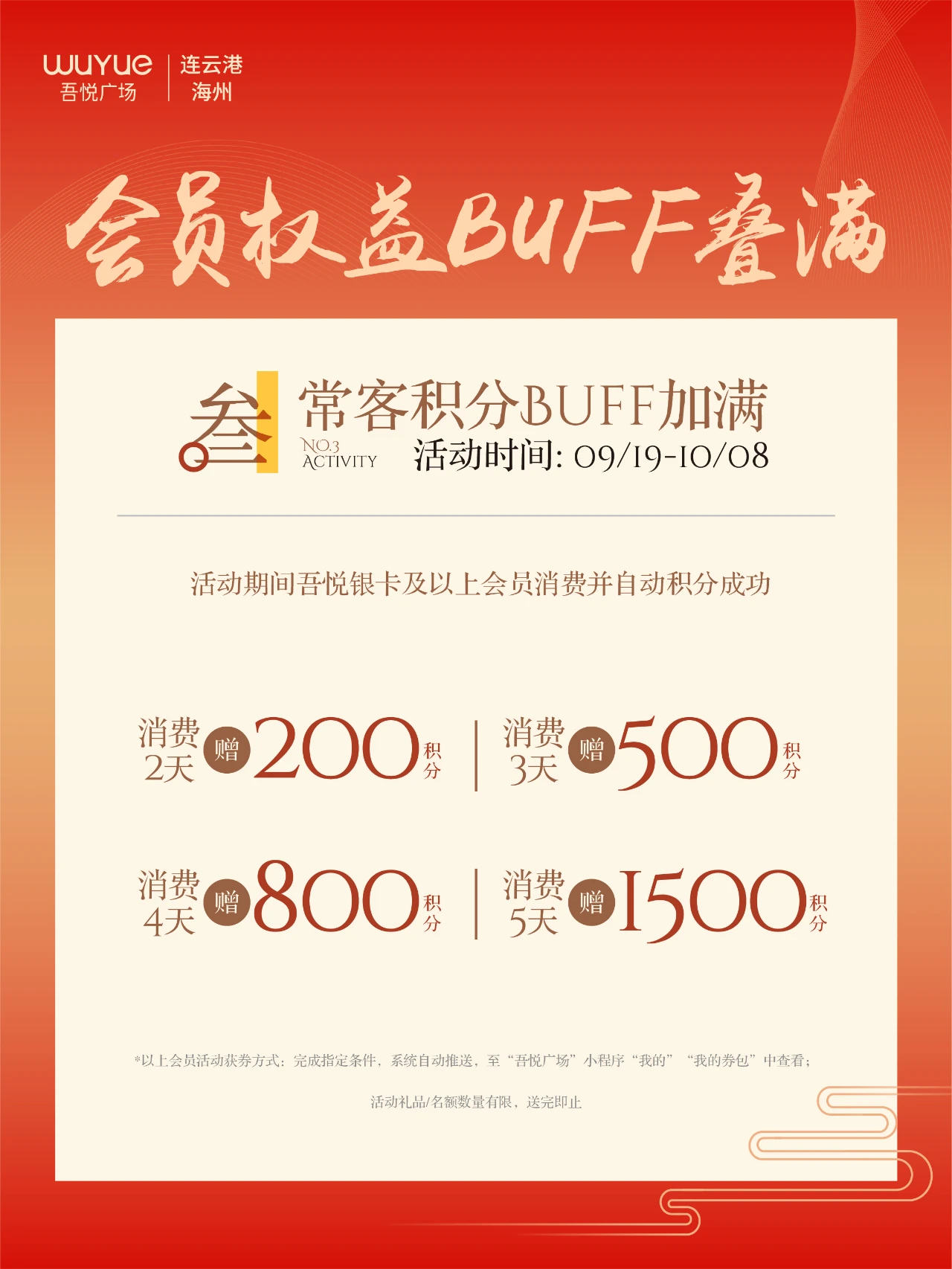 9月19日 - 10月8日,银卡及以上会员消费积分,消费2天送200积分,3天再送500,4天再送800,5天再送1500,积分涨不停 ! 积分当钱花