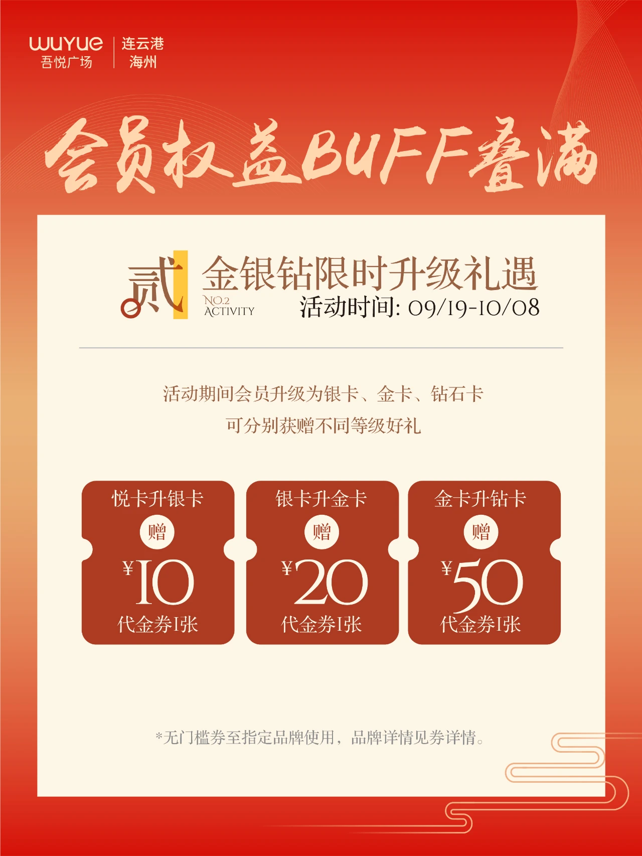 9月19日 - 10月8日,会员升级有礼!悦升银赠10元券,银升金赠20元券,金升钻赠50元券,升级动力满满 !