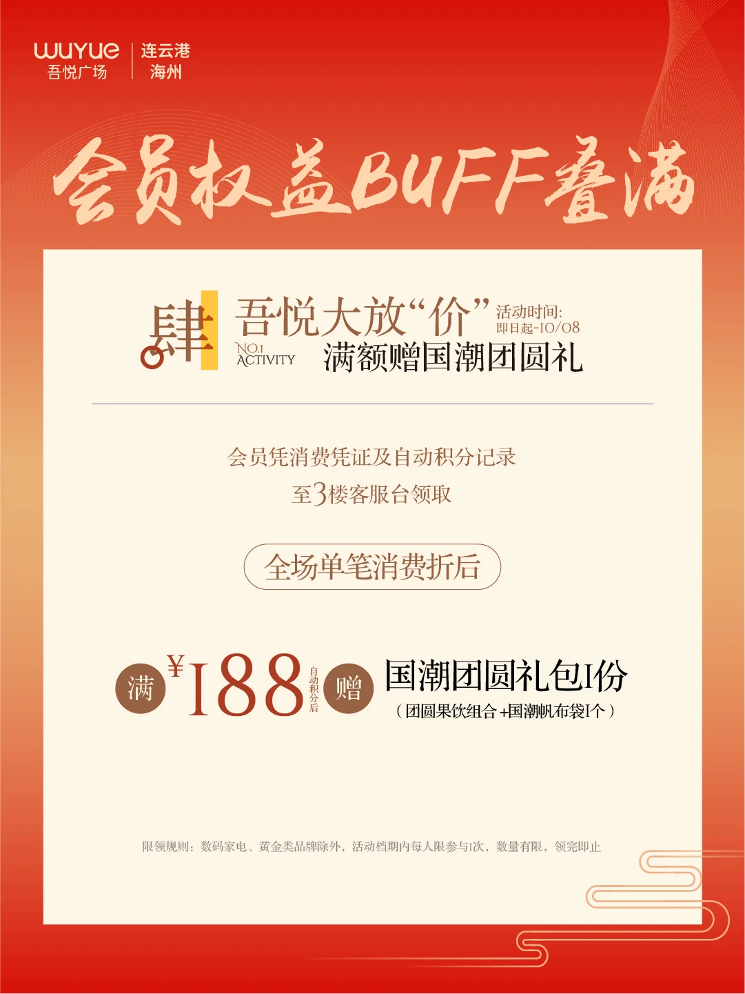 满额赠国潮礼:即日起至10月8日,在3F客服台,非数码家电、黄金类消费满188元 ,即可获赠团圆礼包一份,让你购物满载而归。