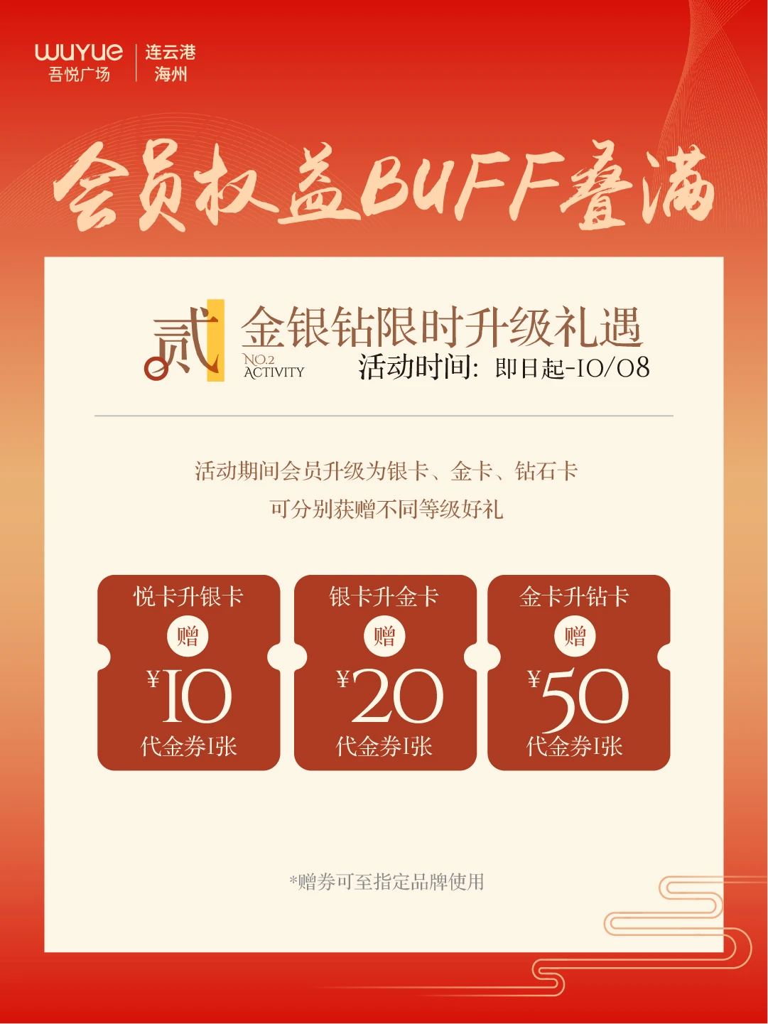 金银钻升级礼遇:即日起至10月8日,会员升级有好礼 。悦升银赠10元券 ,银升金赠20元券,金升钻赠50元券。