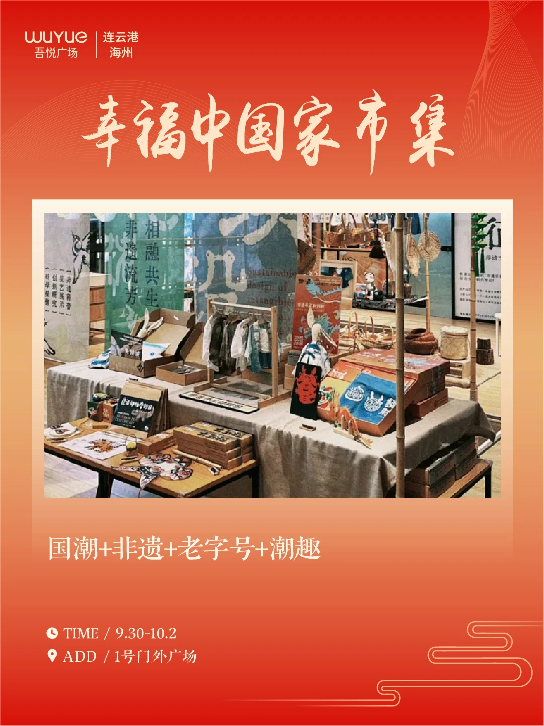 幸福中国家市集:9月30日 - 10月2日,1号门外广场变身欢乐市集 。国潮、非遗、老字号、潮趣元素汇聚一堂 ,让你在逛吃逛玩中,开启一场奇妙的国庆之旅。