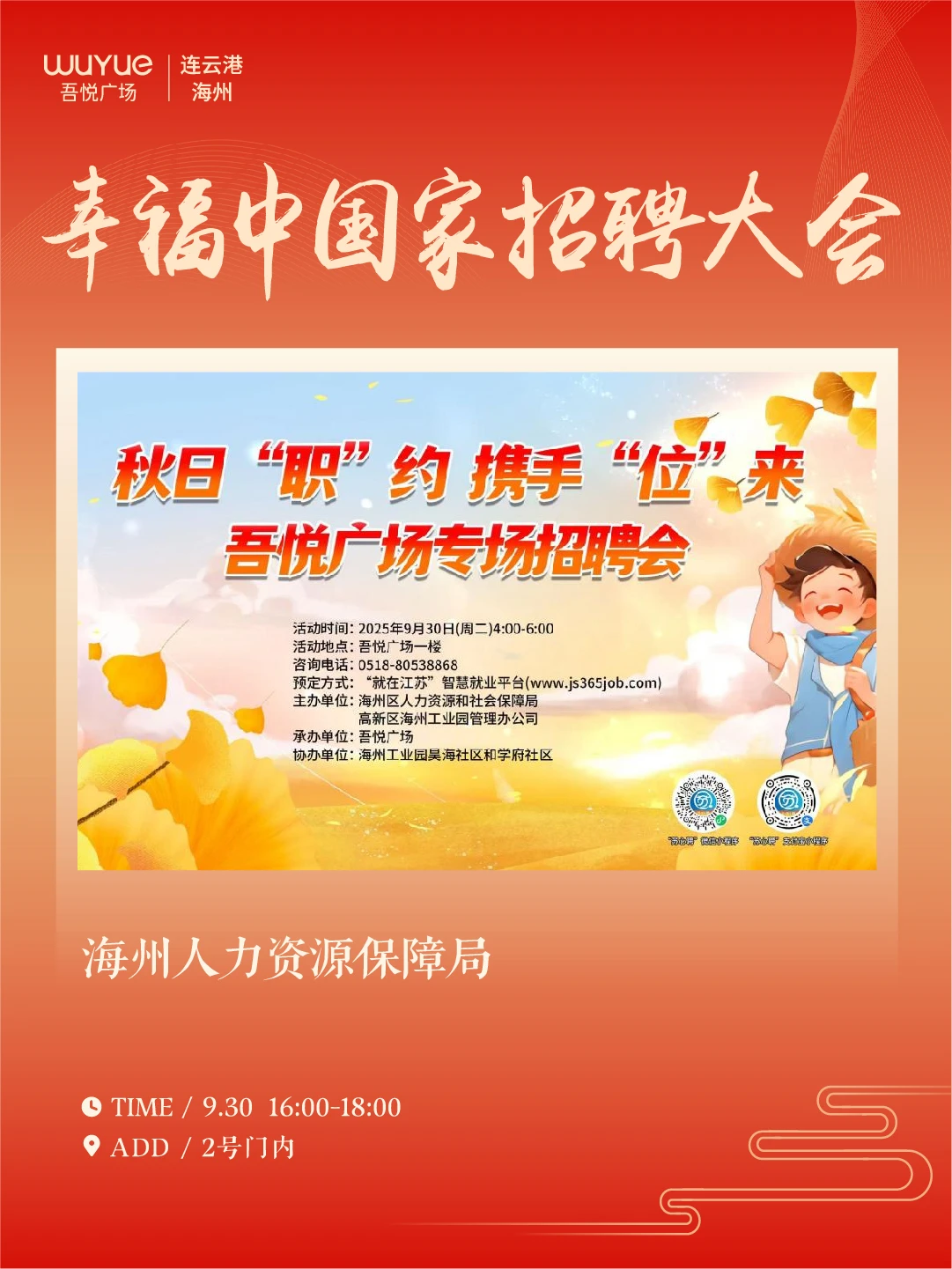 幸福中国家招聘大会:9月30日16:00 - 18:00,由海州人力资源保障局主办 ,在2号门内场举行。众多优质岗位汇聚,为求职者提供广阔的就业选择,助力梦想起航 。