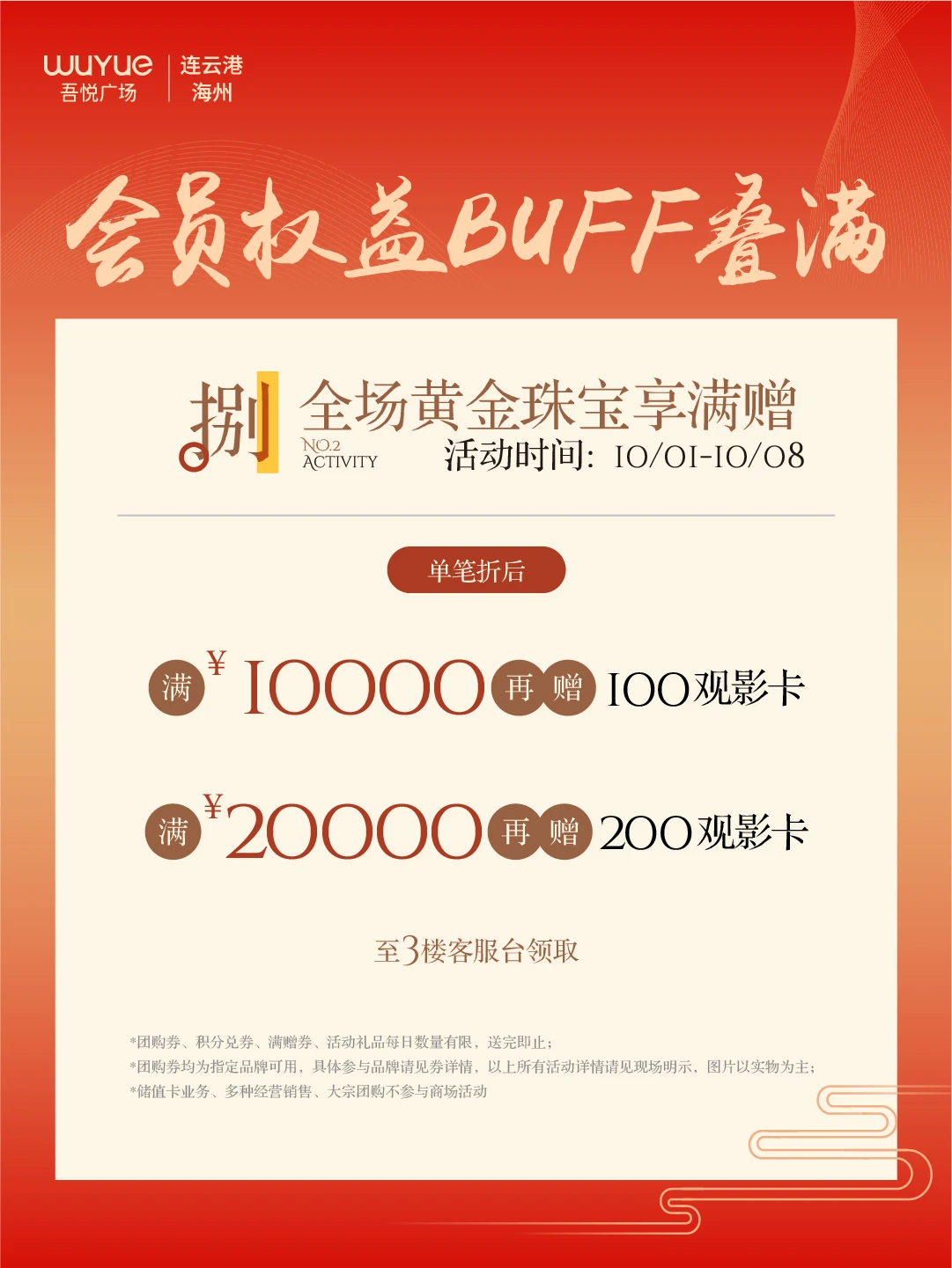 黄金珠宝满赠:10月1日 - 10月8日,在3楼客服台,黄金珠宝折后满额赠观影卡,让你在购买珠宝的同时,还能享受观影的乐趣。