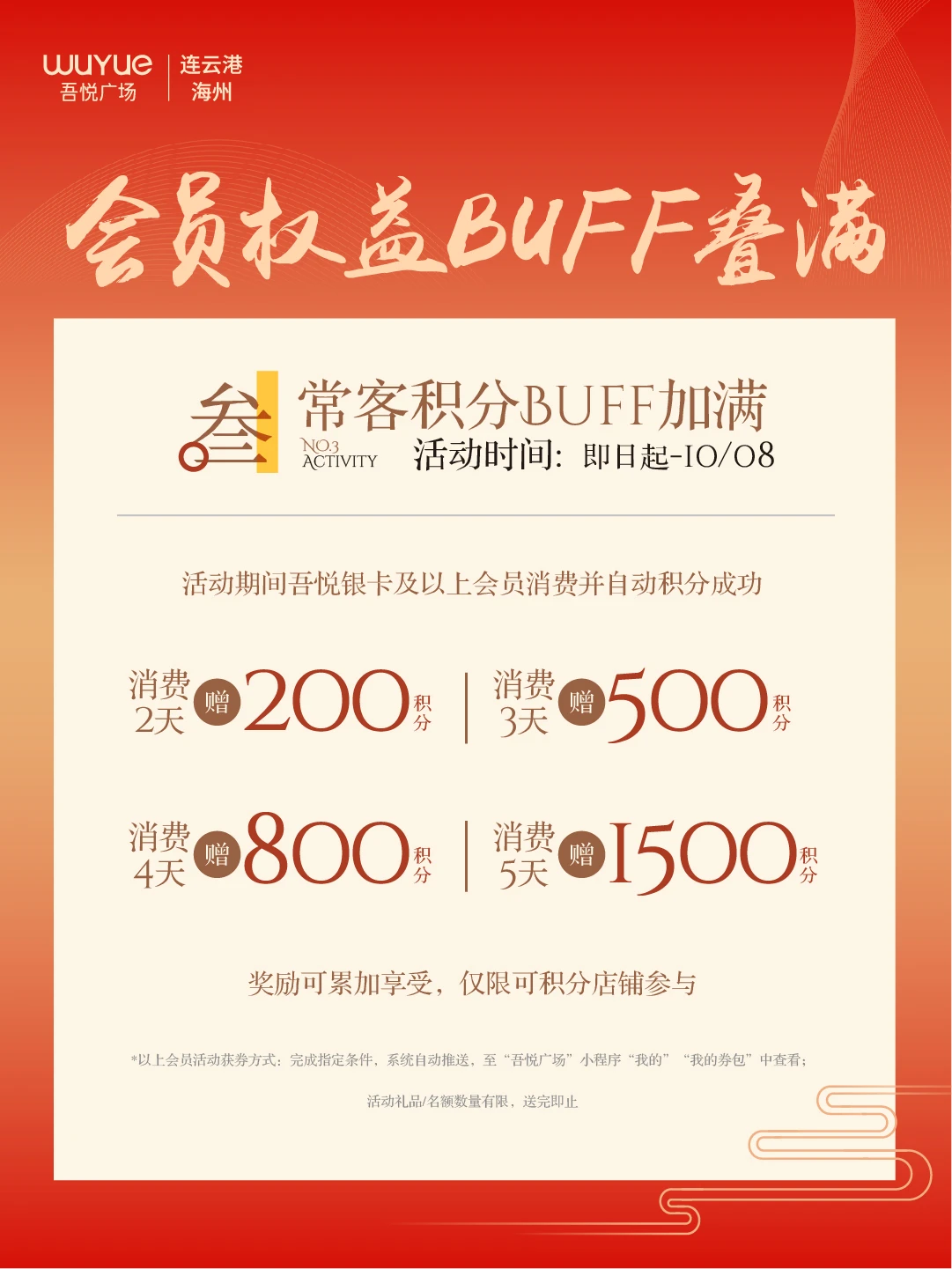 常客积分加满:即日起至10月8日,银卡及以上会员消费积分 ,连续消费2 - 5天,积分奖励累加。消费越多,积分越多,福利越丰厚 。