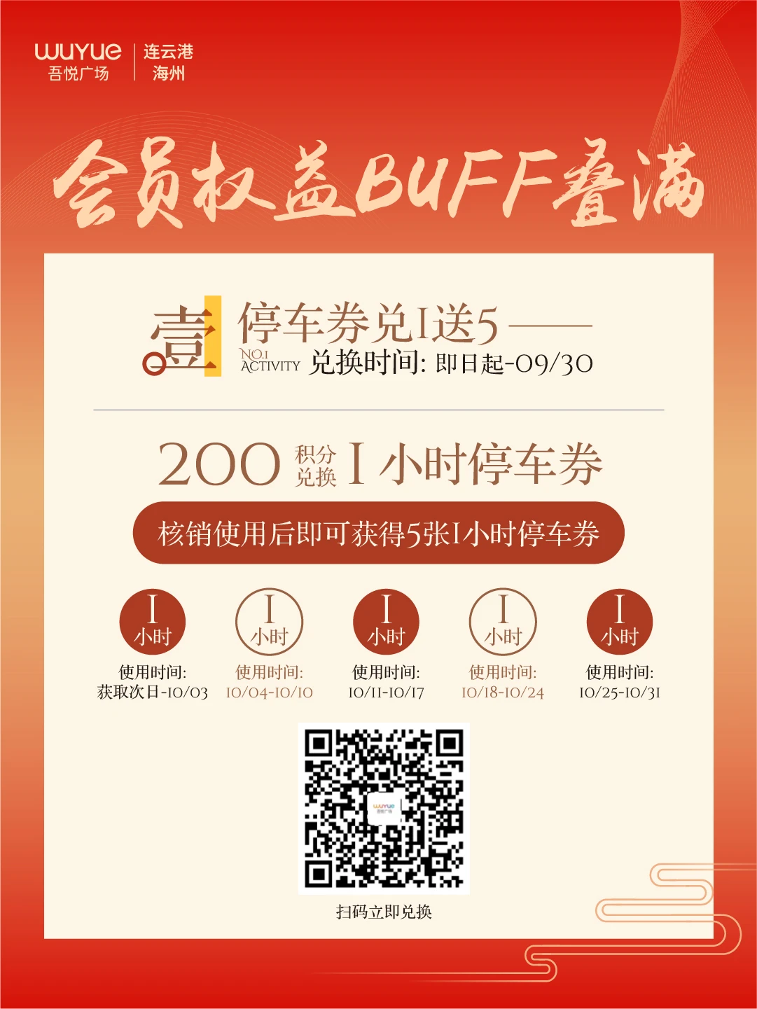 停车券兑1送5:即日起至9月30日,200积分可换1小时停车券并核销 ,即可获得5张1小时停车券。按规则时段使用,让你停车无忧 。