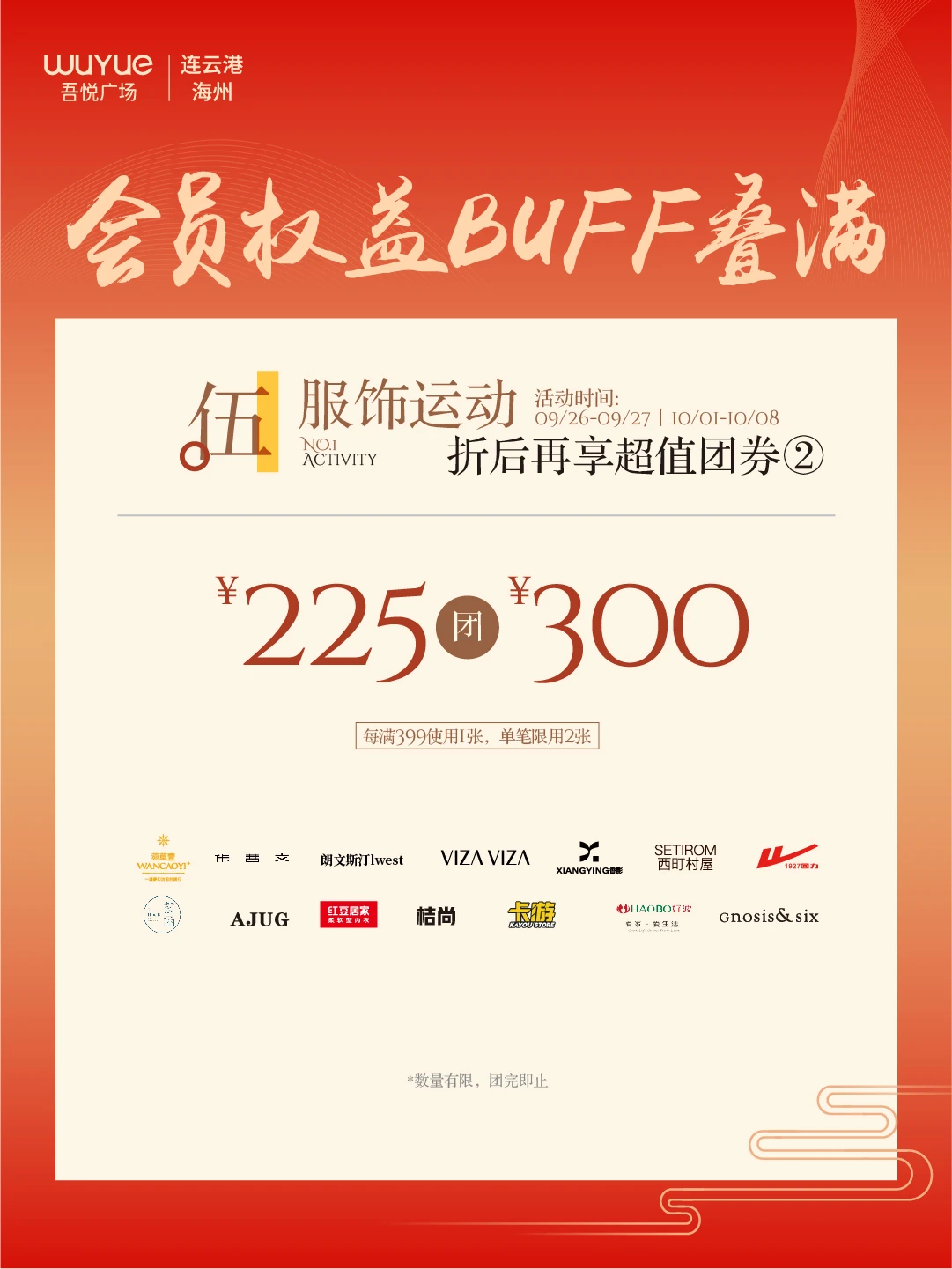 十大精选品牌40团50:即日起至10月8日,单笔消费满100元可用5张券 ,超值优惠,不容错过。