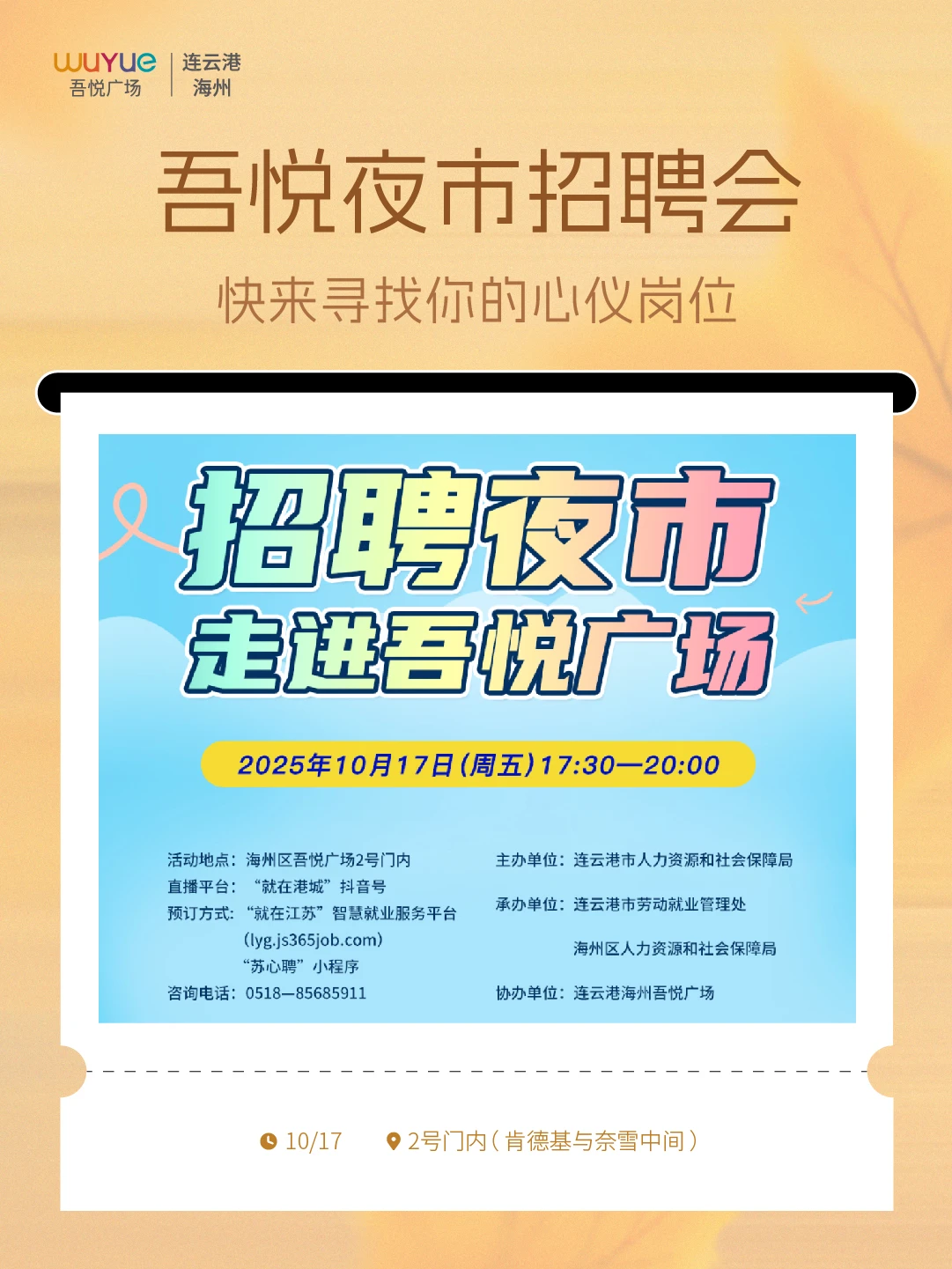 秋意渐浓,吾悦广场为你精心筹备了一场集求职、美食、潮玩、购物于一体的十月狂欢盛宴!无论你是寻找心仪工作的职场新人,还是追求味蕾享受的美食家,亦或是热爱生活的潮流达人,这里都有属于你的精彩!