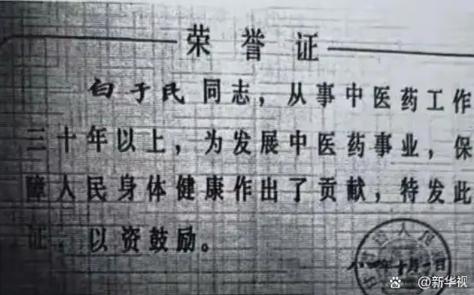 一九七九年七月,外公办理了退休。一九八四年十月一日,甘肃省人民政府为他颁发了荣誉证书,表彰他“从事中医药事业三十年,为发展中医药事业,保障人民身体健康作出了贡献”。外公拿到证书的那天,看了很久,然后小心翼翼地收起来,什么也没说。于他而言,最大的荣誉不是那张纸,而是老百姓口中那句“白大夫是个好人”。一九八五年二月八日,外公终因肺心病心力衰竭,与世长辞。